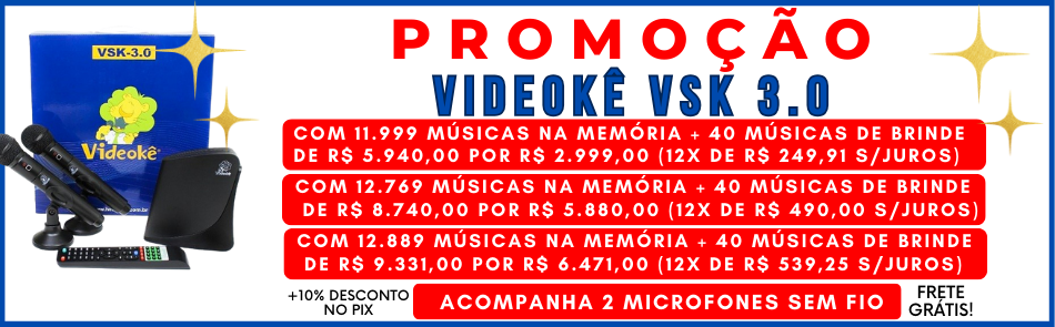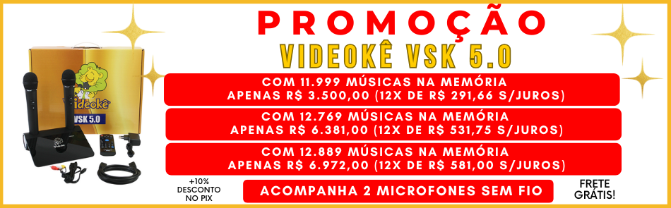 ![]() VIDEOKÊ VSK 5.0 COM 11.999 MÚSICAS 2 Mic. s/fio + 11.999 Músicas Repertório até 2022 Apenas R$ 3.500,00 12x de R$ 291,66 s/juros R$ 3.150,00 (Pix/boleto) SEDEX GRATIS |